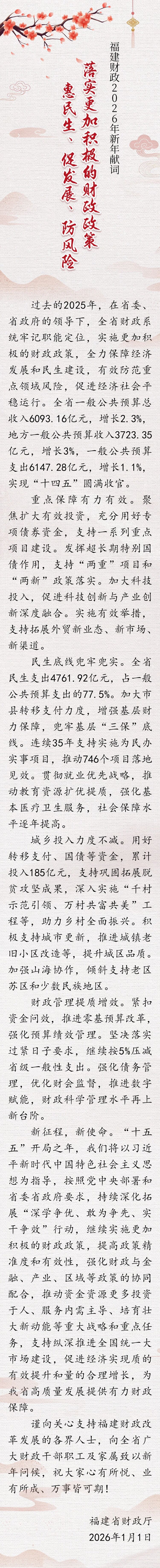 落实更加积极的财政政策 惠民生、促发展、防风险 ——福建财政2026年新年献词