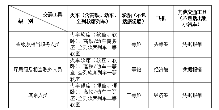 第七条 出差人员应当按规定等级乘坐交通工具。乘坐交通工具的等级见下表: