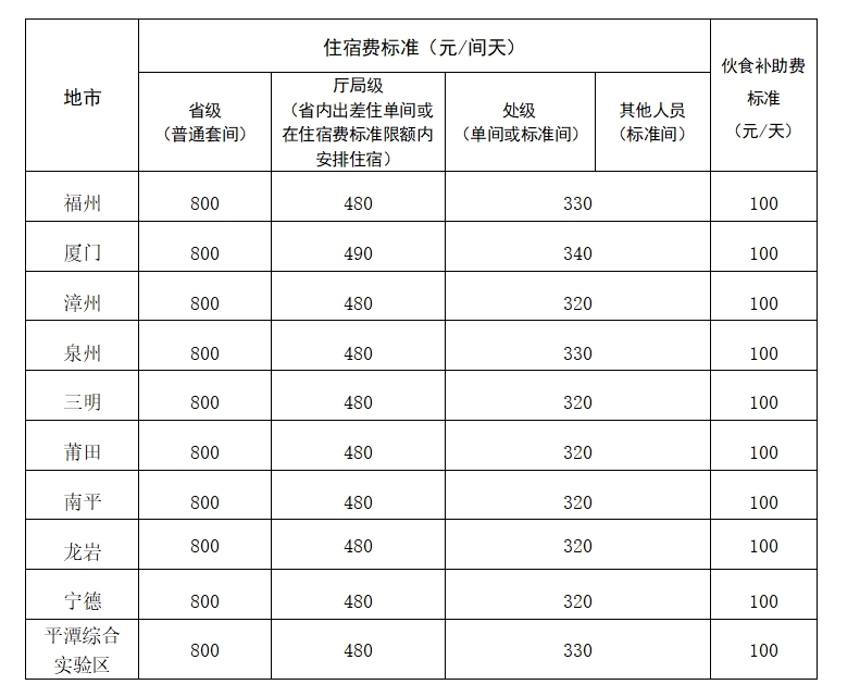 第十二条 省财政厅分地区制定省内出差住宿费限额标准。各设区市财政局、平潭综合实验区财政金融局根据当地经济社会发展水平、市场价格、消费水平等因素,提出所在市住宿费限额标准报省财政厅,经省财政厅统筹研究提出意见反馈地方审核确认后,由省财政厅统一发布作为省直单位工作人员到省内相关地区出差的住宿费限额标准(见附件1)。